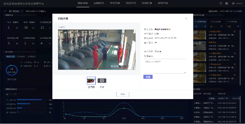 2)園區安防解決方案:采用安監算法對未按要求穿安全服、戴安全帽的行為進行監測;采用煙霧、明火監測算法對關鍵區域設置煙霧明火監測并報警;對特定區域設置漏油檢測及時發現油品泄露情況。